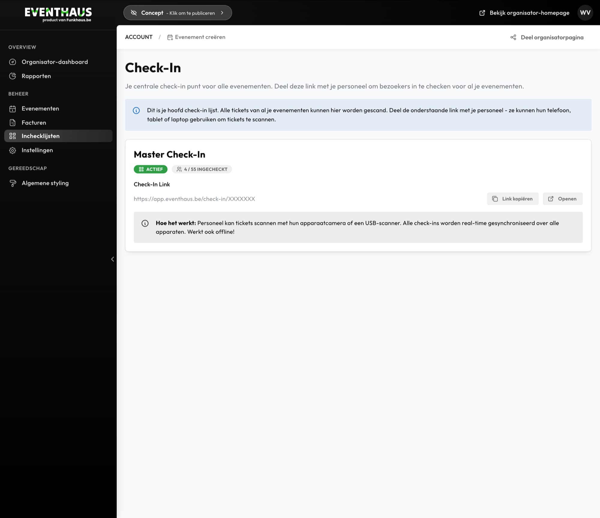 Eventhaus is ontworpen met één doel: alles moet logisch, overzichtelijk en snel werken. Geen overbodige knoppen, geen complexe instellingen, geen handleidingen van tien pagina’s.
